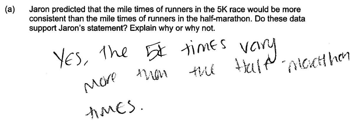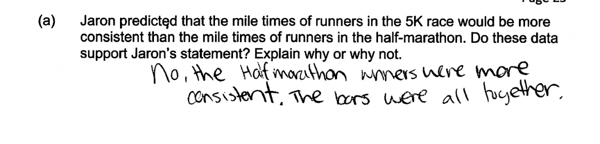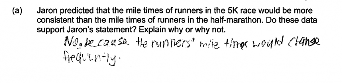 Other common errors in part (a) responses are illustrated in the following student responses. The response below is typical of those from students who believed that “more consistent” means more variability rather than less variability in the mile times. Students who made this error indicated that the data supported Jaron’s prediction, and were scored as incorrect for part (a).