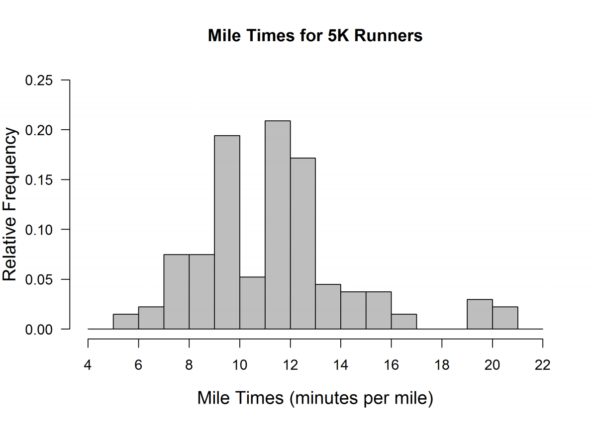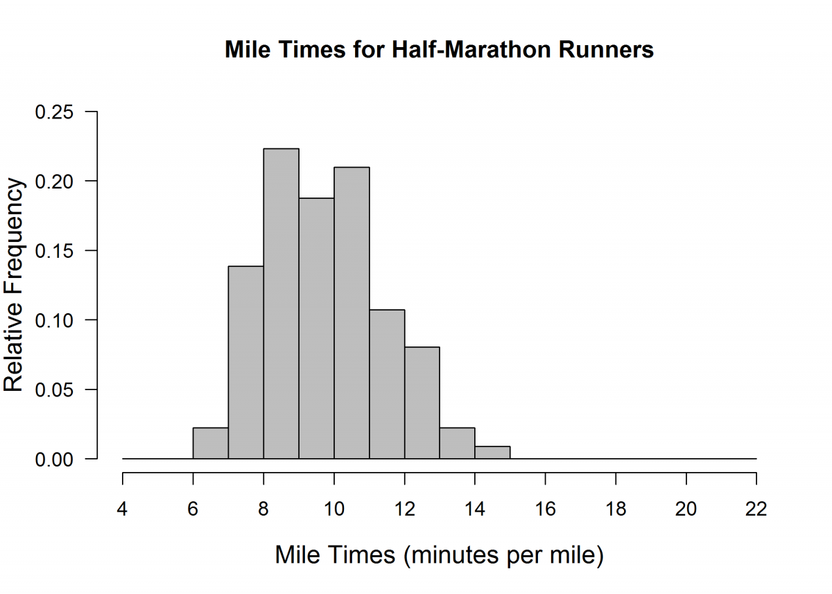 The city of Gainesville hosted two races last year on New Year’s Day. Individual runners chose to run either a 5K (3.1 miles) or a half-marathon (13.1 miles). One hundred thirty four people ran in the 5K, and 224 people ran the half-marathon. The mile time, which is the average amount of time it takes a runner to run a mile, was calculated for each runner by dividing the time it took the runner to finish the race by the length of the race. The histograms below show the distributions of mile times (in minutes per mile) for the runners in the two races.