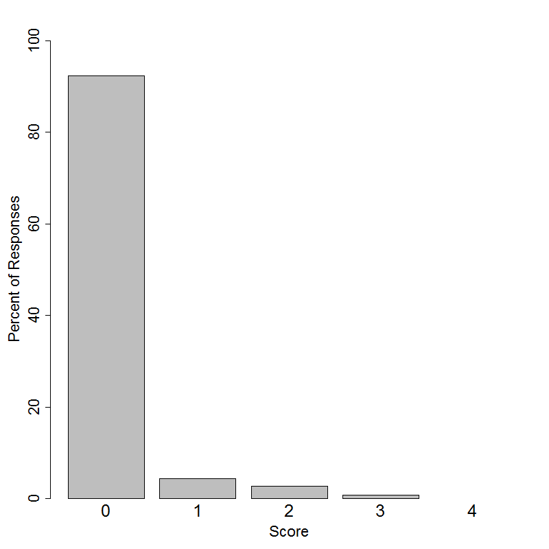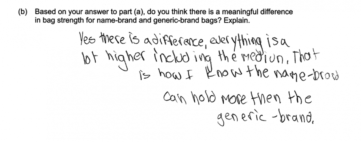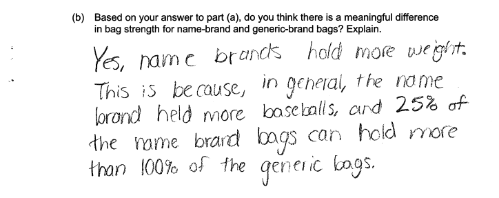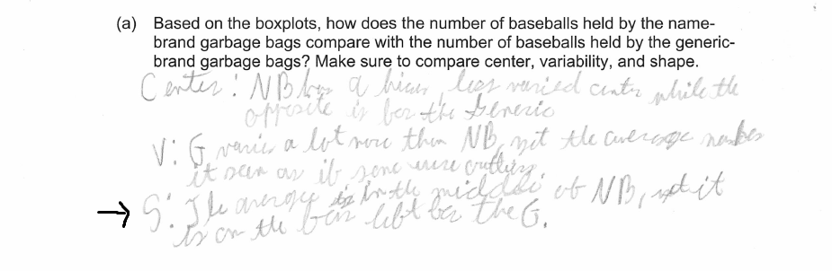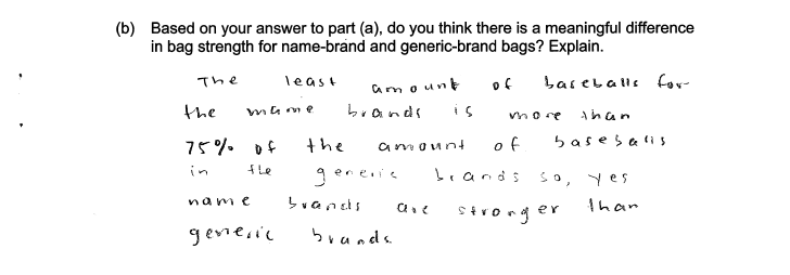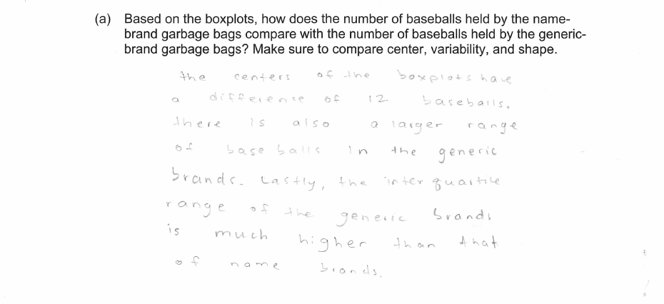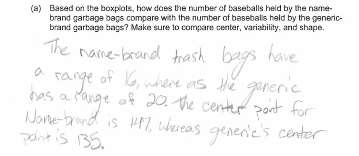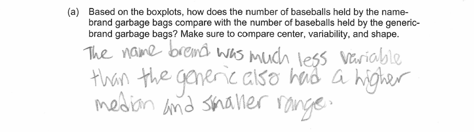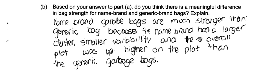 While some students demonstrated the ability to use boxplots to compare distributions, none of the students in the initial administration of this exam provided responses that correctly compared center, variability, AND shape. The following student response shows a fairly good understanding of the concepts assessed by this question and received a score of 3. In part (a), there are comparative statements for both center and a measure of variability (range), but there was no comparison of shape. Therefore, part (a) was scored as partially correct. In part (b), the student indicates that name brand garbage bags are stronger than generic bags. While they make a weak statement about separation in part (b), their last statement in part (a) is used as further support for their argument regarding separation of the boxplots, and part (b) was scored as essentially correct. With one part essentially correct and one part partially correct, this student response received a score of 3.