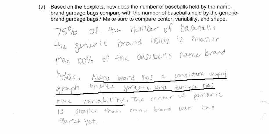 In general, many student responses exemplified a lack of vocabulary to adequately describe the boxplots, particularly when it came to describing distribution shape. For example, in the student response below the response says that “graph” for name-brand bags has a more “consistent” shape than the generic-brand boxplot rather than using terms more appropriate for describing the shape of a distribution such as symmetric and skewed.