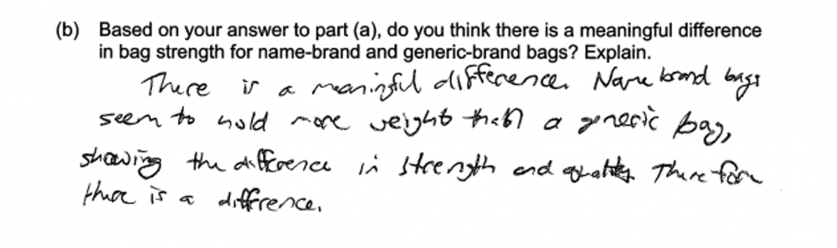 Many students indicated that there was a meaningful difference but did not provide an explanation to support this conclusion. Responses like the one below were scored as incorrect for part (b).