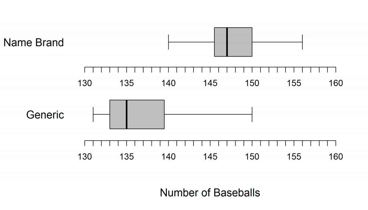 To find out whether name-brand garbage bags hold more weight than generic-brand garbage bags, an eighth-grade class purchased 100 name-brand trash bags and 100 generic-brand garbage bags. They loaded each bag with baseballs until the bag broke. The number of baseballs put into each bag before the bag broke was recorded. The boxplots below were created using the recorded data.