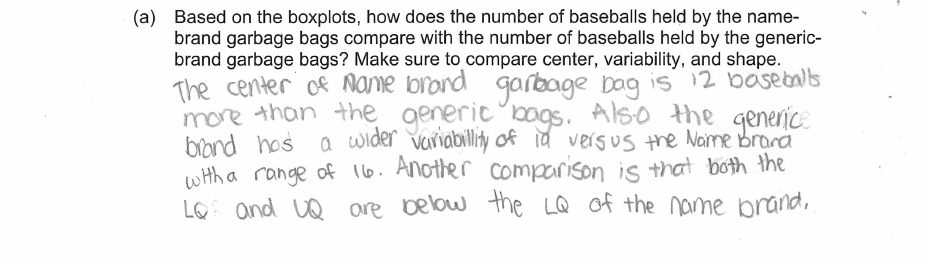 Many students make correct statements regarding the variability of the two boxplots. The number of baseballs held by the name-brand garbage bags does appear to vary less than the number of baseballs held by the generic-brand bags. However, many students failed to make reference to the information provided in the boxplots (such as the ranges or the IQRs) to support their comparison of the variability. The following student response is typical of those making this error.