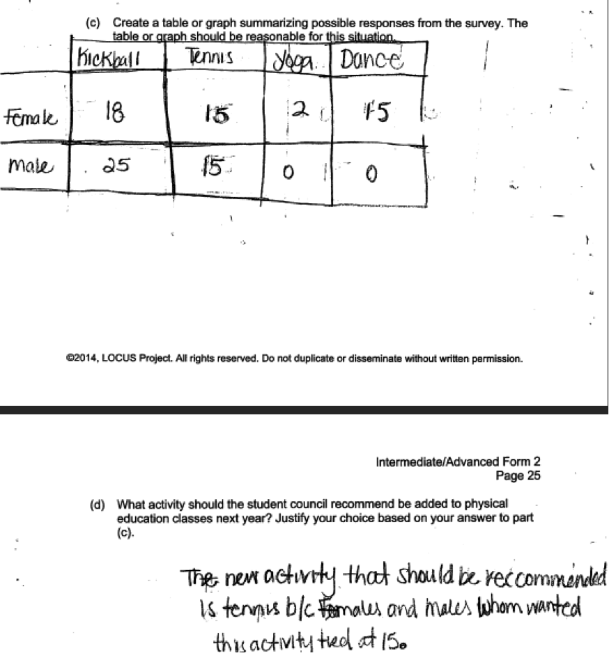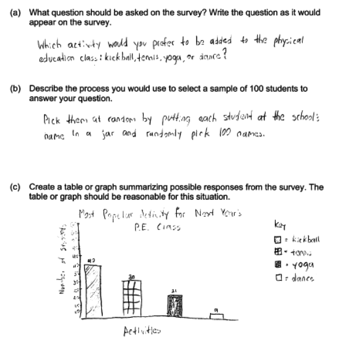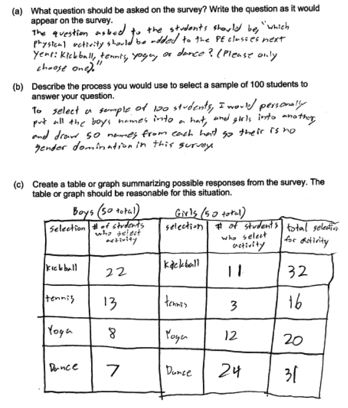 Some students chose to stratify the population (divide into subgroups) based on sex or grade level and then select a random sample from each of these groups. While not required, this is also an acceptable approach as long as random samples are selected from each subgroup and the table or graph in part (c) and conclusion in part (d) are appropriate. The student response below proposes a sampling method that stratifies by sex, and also received a score of 4. Note: There is an arithmetic error in the kickball row as the total should be 33. This was not viewed as an error that took away from statistical understanding.