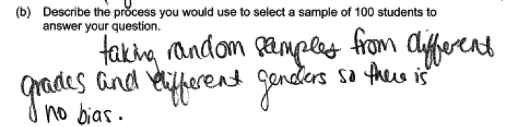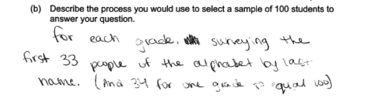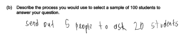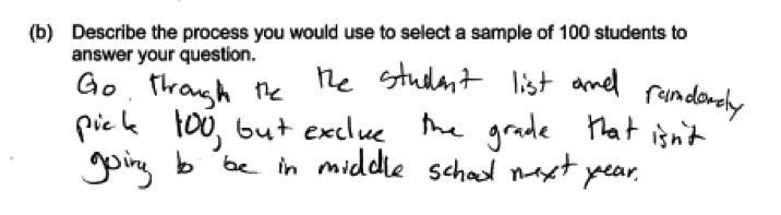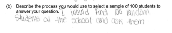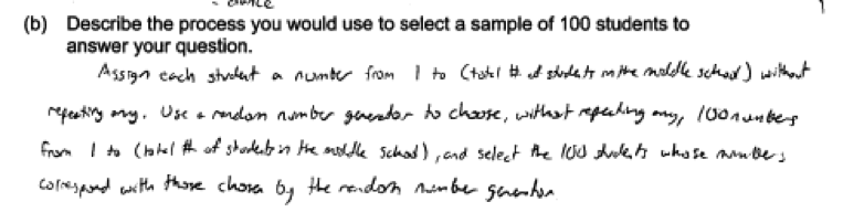 There were two common errors in the student responses to part (b). The first was failure to provide sufficient detail when describing the process for selecting a sample. To be considered essentially correct, the description of the process needed to provide enough detail so that someone who read the description could actually implement the process. The following are examples of student responses that were scored as only partially correct because they recognized the need for random selection, but provided insufficient detail in the description of the process.