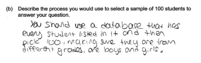 While many students described a sampling process that involved writing the names of students at the school on slips of paper, putting them into a container, mixing and then selecting 100 slips of paper from the container, some student described a process that used a list of students and random numbers to select the students for the sample. This is also a correct approach, and the following student response illustrates this approach.