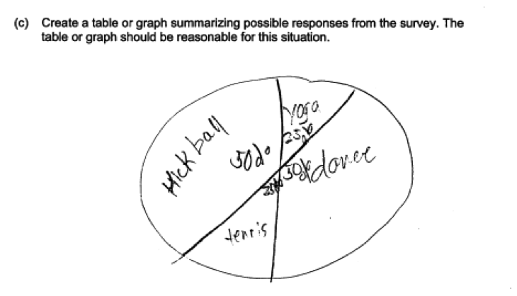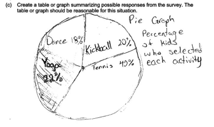 The response above used a bar chart in part (c), but using a frequency table or a pie chart are also acceptable ways to summarize the categorical data. The following examples from two other student papers illustrate a response that uses a table and a response that uses a pie chart, respectively. Even though the first example does not report relative frequencies, it could result in a score of essentially correct if the thre response to part (d) includes a justification that is consistent with the table (e.g., “kickball, because it has the most”).