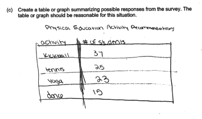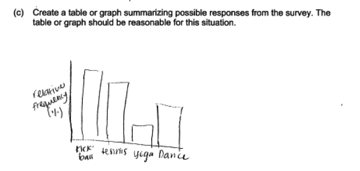 Part (c) asked students to create a table or graph that would be appropriate for the type of data collected.