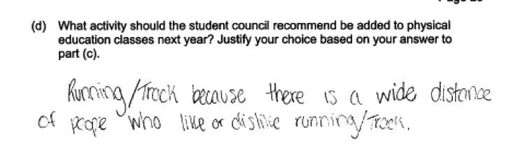 A more common mistake was to ignore the instructions to make and justify a recommendation based on the response to part (c), often naming an activity that was not one of those given in the question as a possibility. Many students responded with their own personal beliefs, as illustrated in the responses that follow, which does not demonstrate a need to make an argument based on or supported by data.